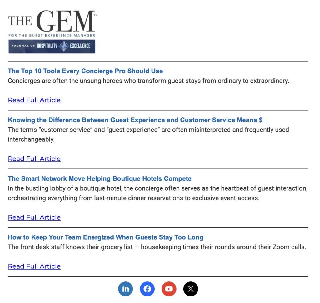 To receive these articles on a regular basis or to request permission to publish of any of these articles, we invite you to send us an email at info@hospitalityexcellence.com or sign up on our contact page.